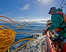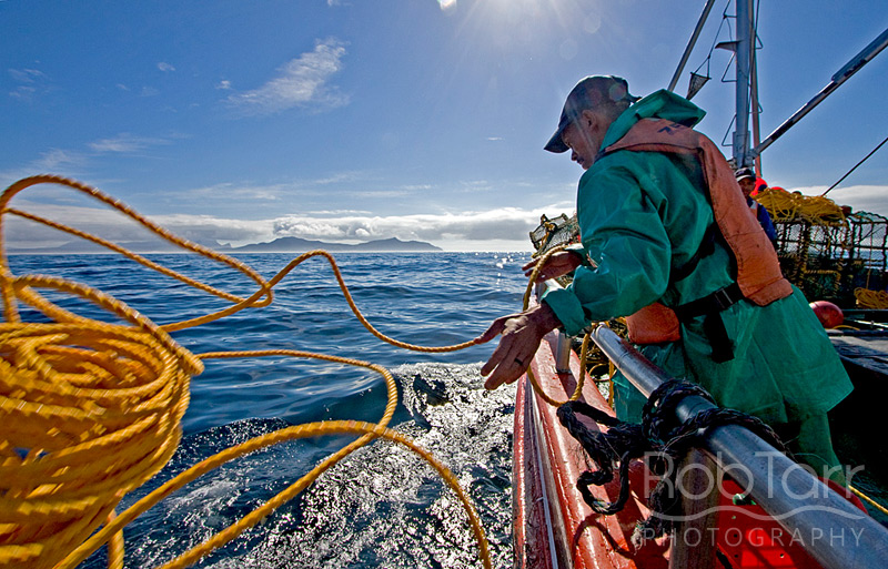 On a commercial boat off Cape Point, a lobster fisher casts a bunch of rope after the trap. The excess rope is tied up in a coil to reduce the chance of entanglement with whales.