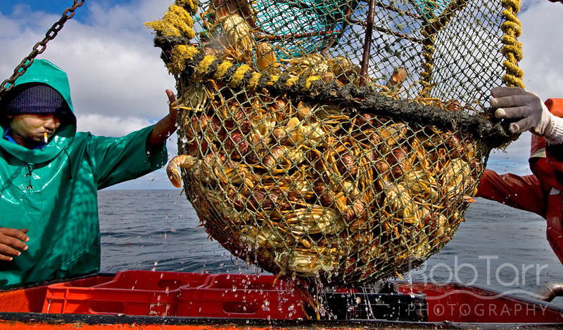 A catch of spiny lobsters is brought aboard and will be emptied over a grid sorter that allows undersized animals to return directly to the sea via a chute.