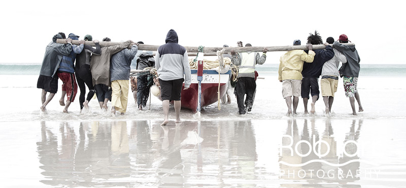 A group of traditional treknet fishers launch at Fish Hoek beach. High key image used to highlight the team effect.