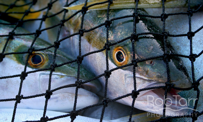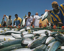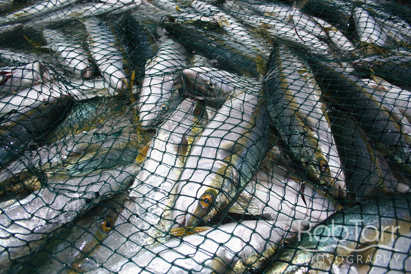 A good catch of yellowtail being held in the water before being transported.
