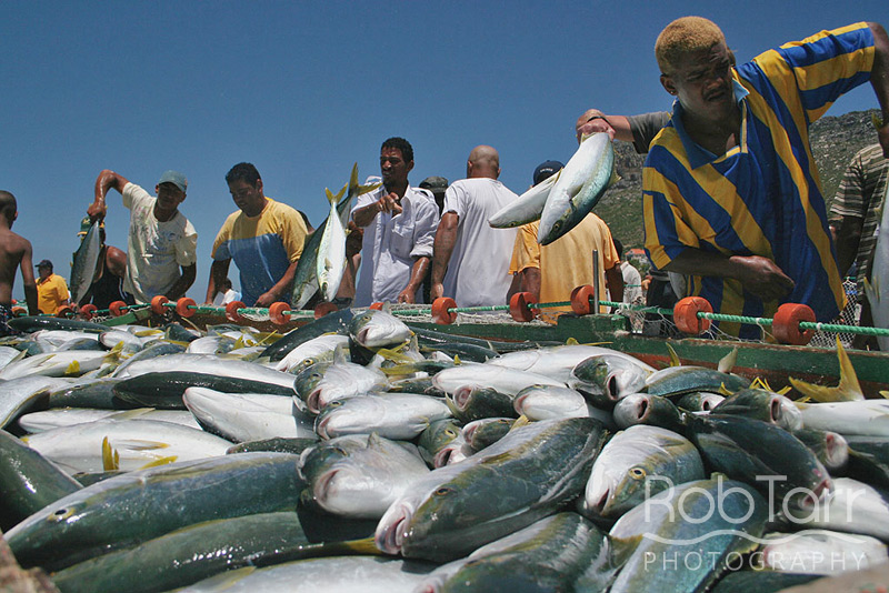 A fisherman throws his roman catch ashore as the boat comes alongside in Kalk bay.